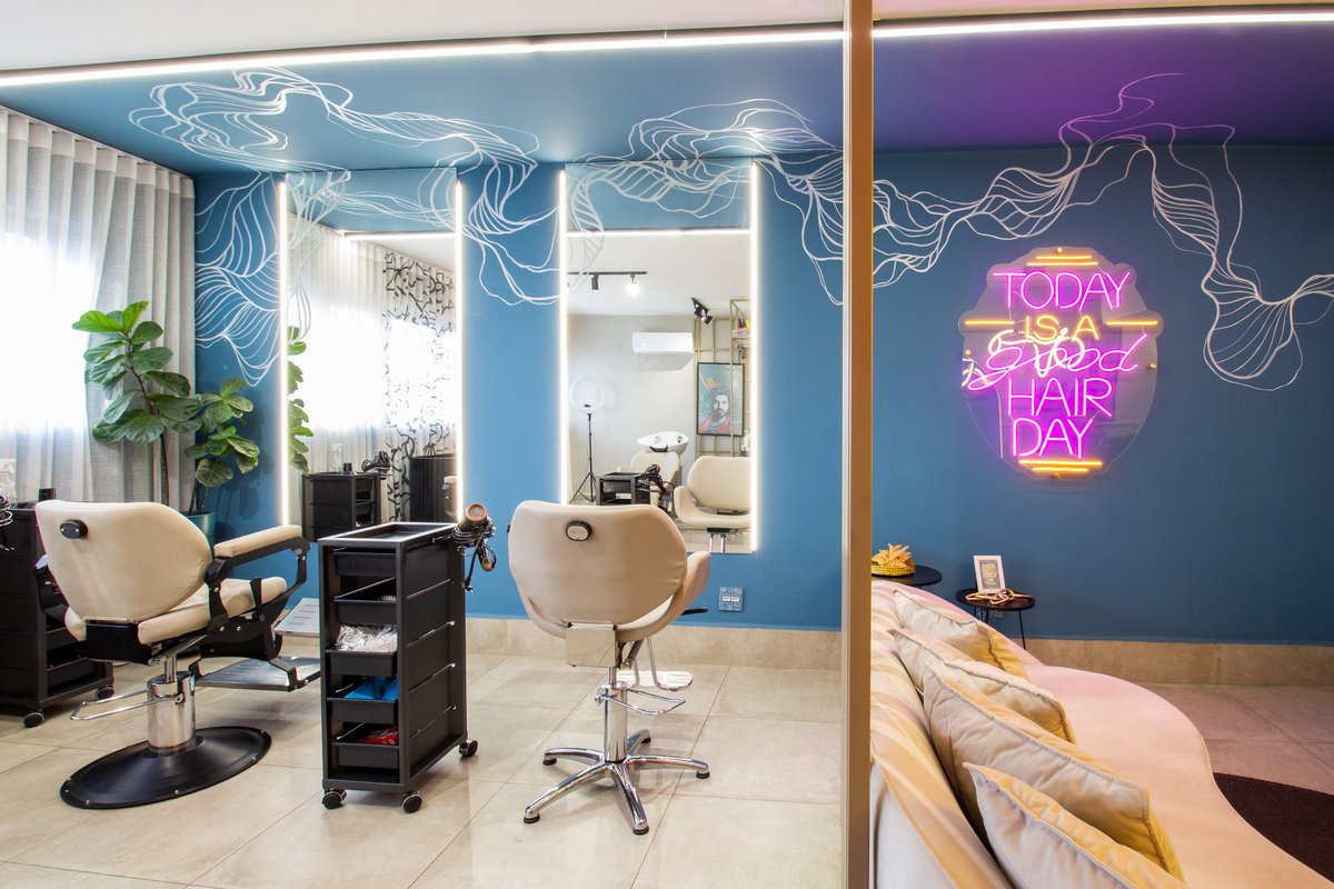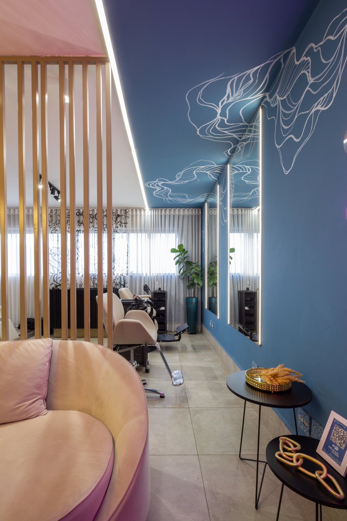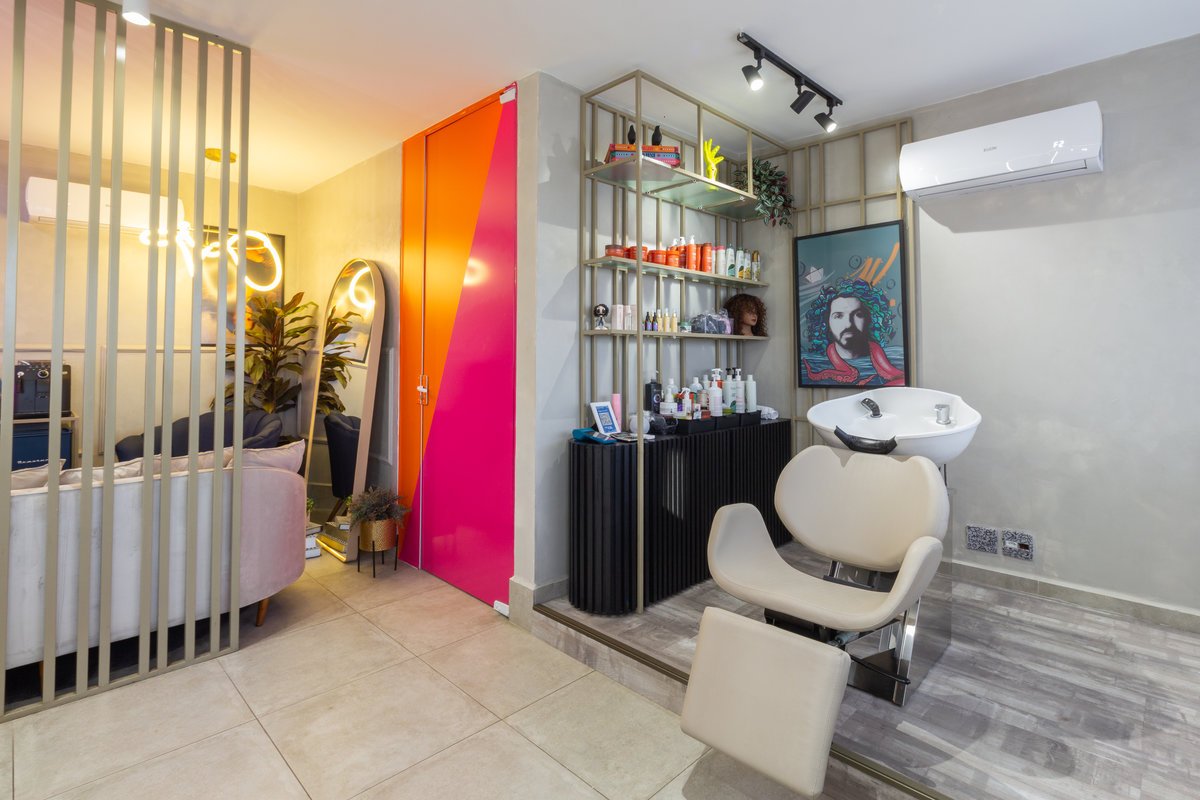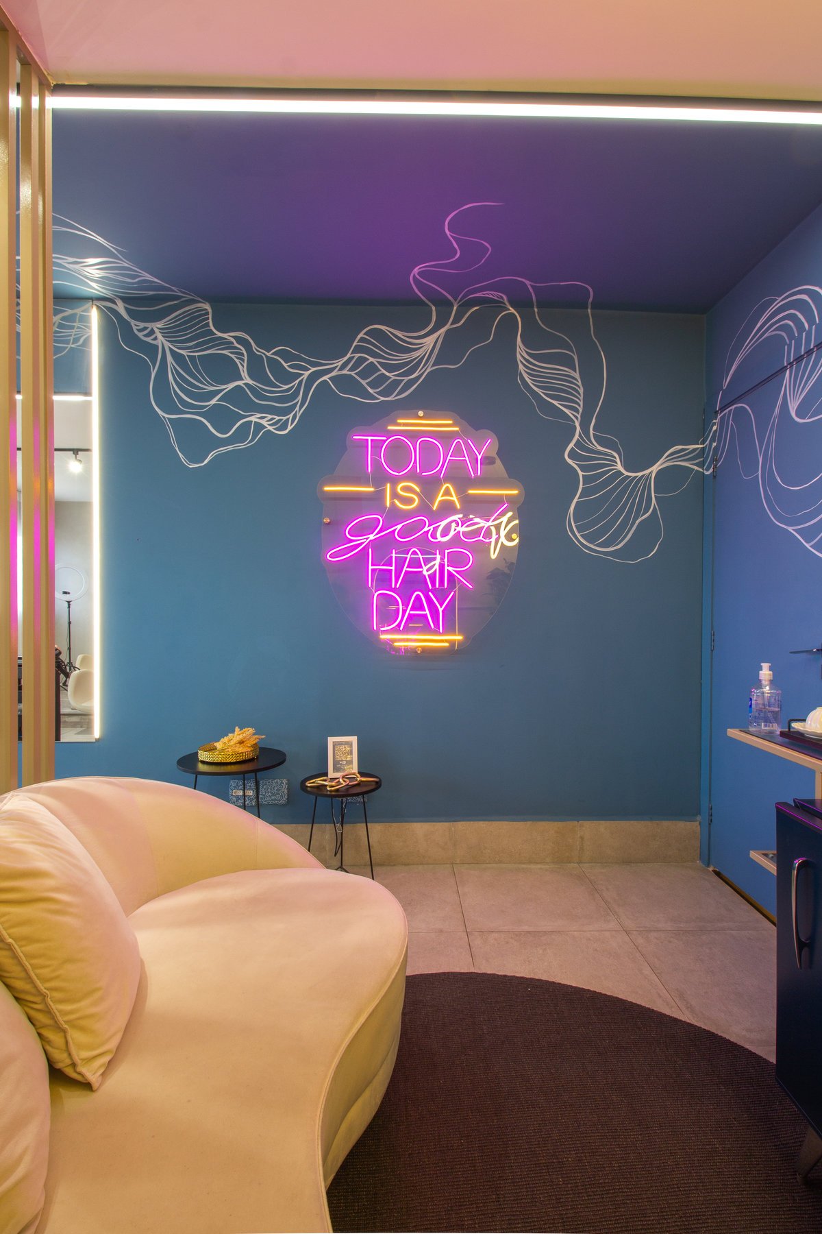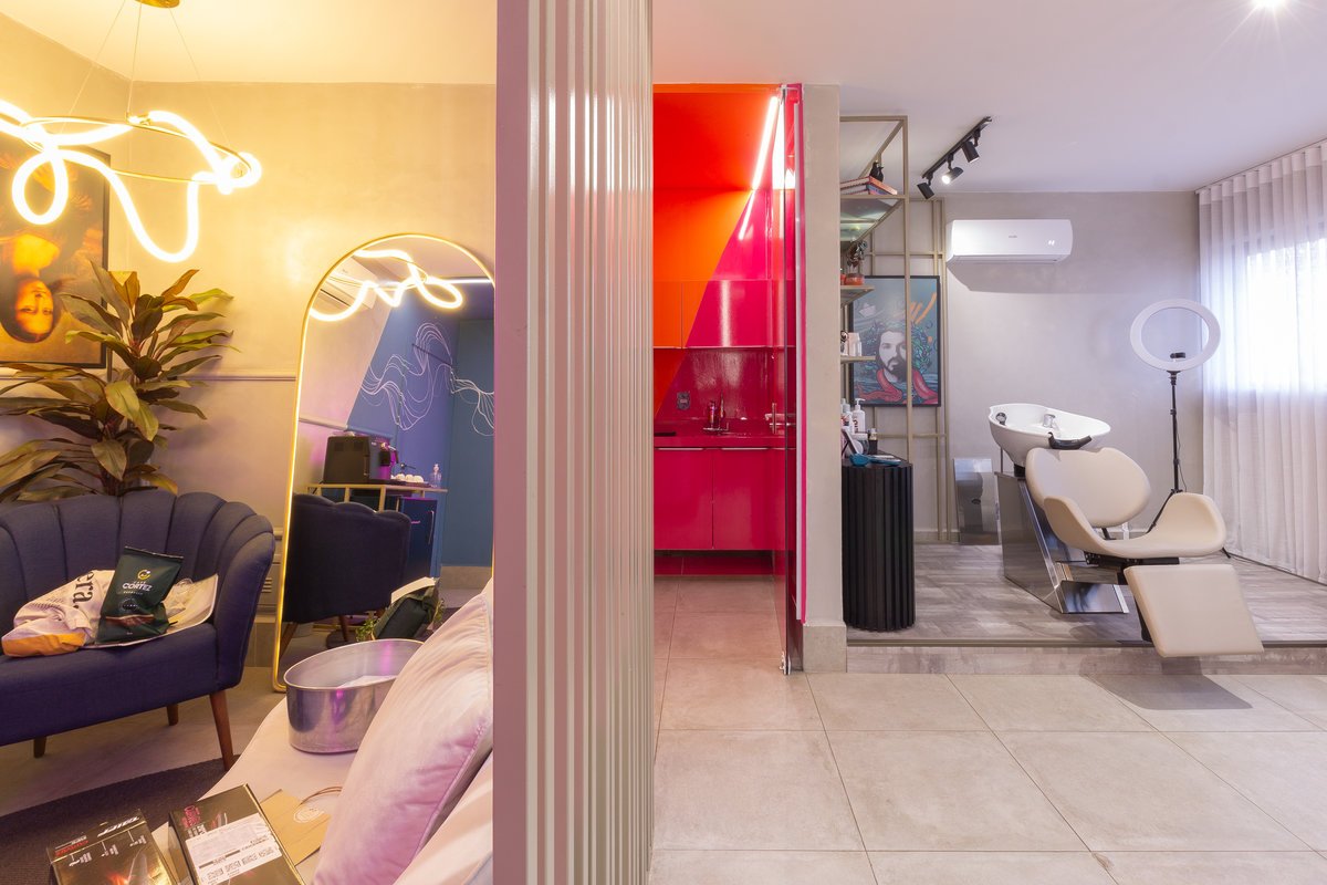 Um espaço que vai além da função e entrega uma experiência: este é o Studio Encaraconando. Inspirados em referências acumuladas ao longo dos últimos dez anos, traduzimos todo o acervo do cliente em um ambiente que mescla elementos do pop art, do “sereismo” e, sobretudo, das curvaturas de um cabelo cacheado. Assim como os cachos simbolizam confiança e identidade, este projeto reflete a essência de que autenticidade é força e beleza.